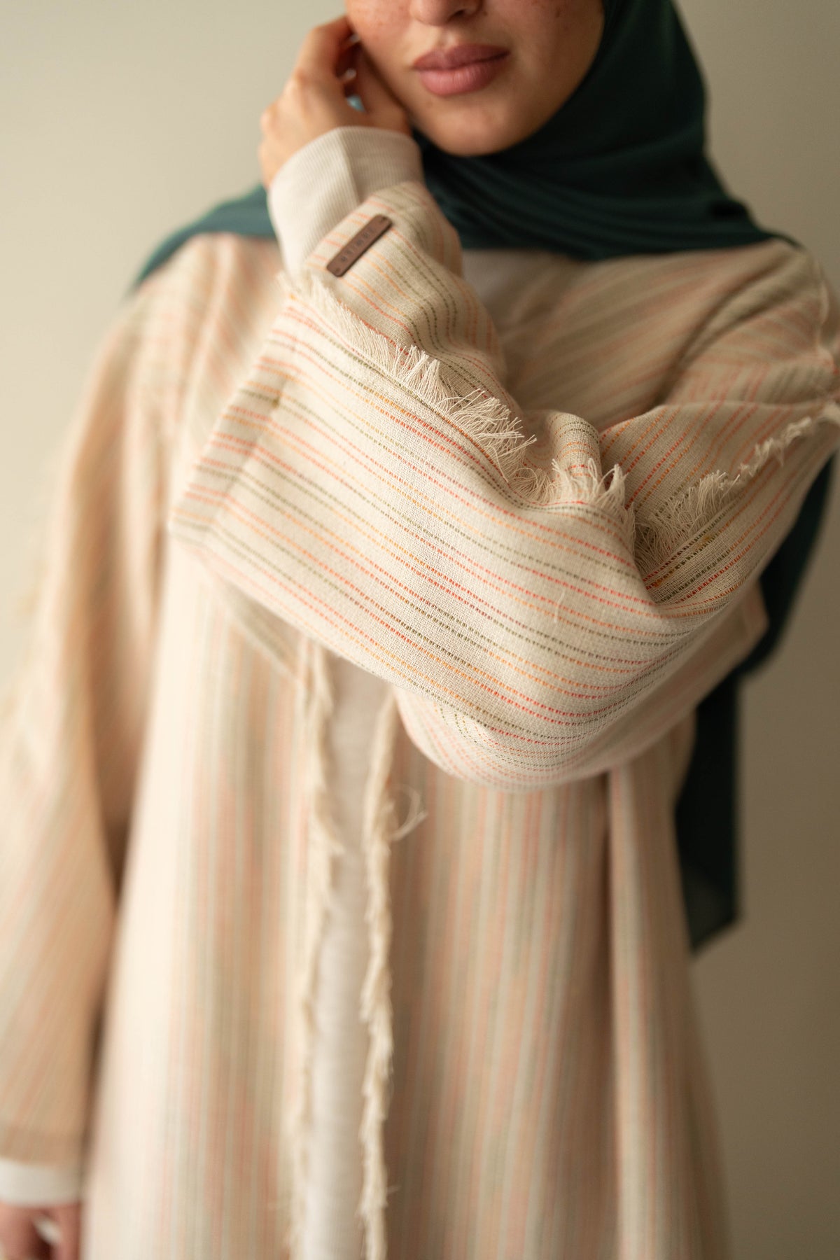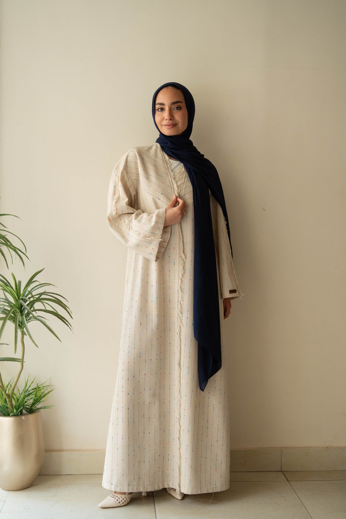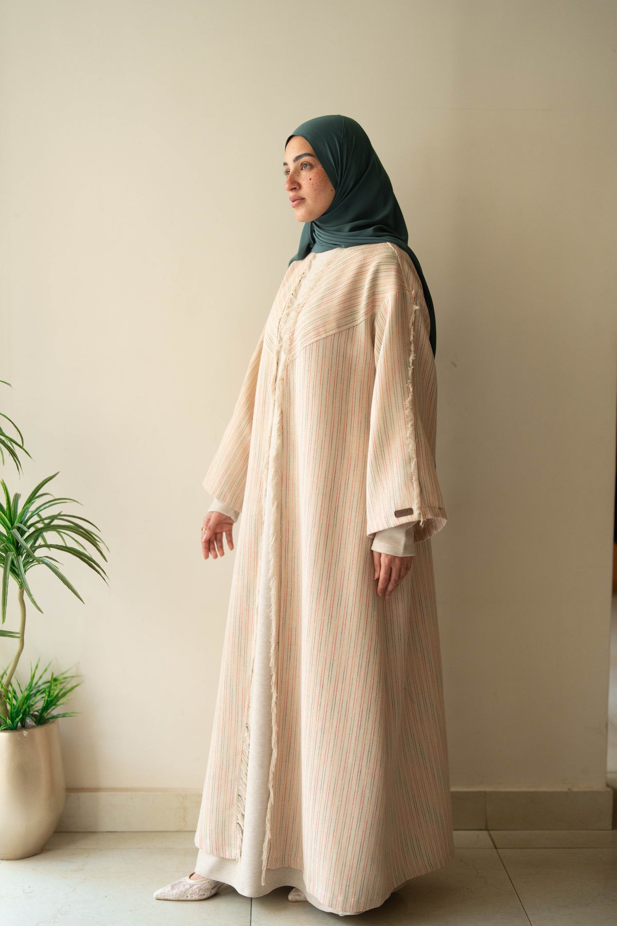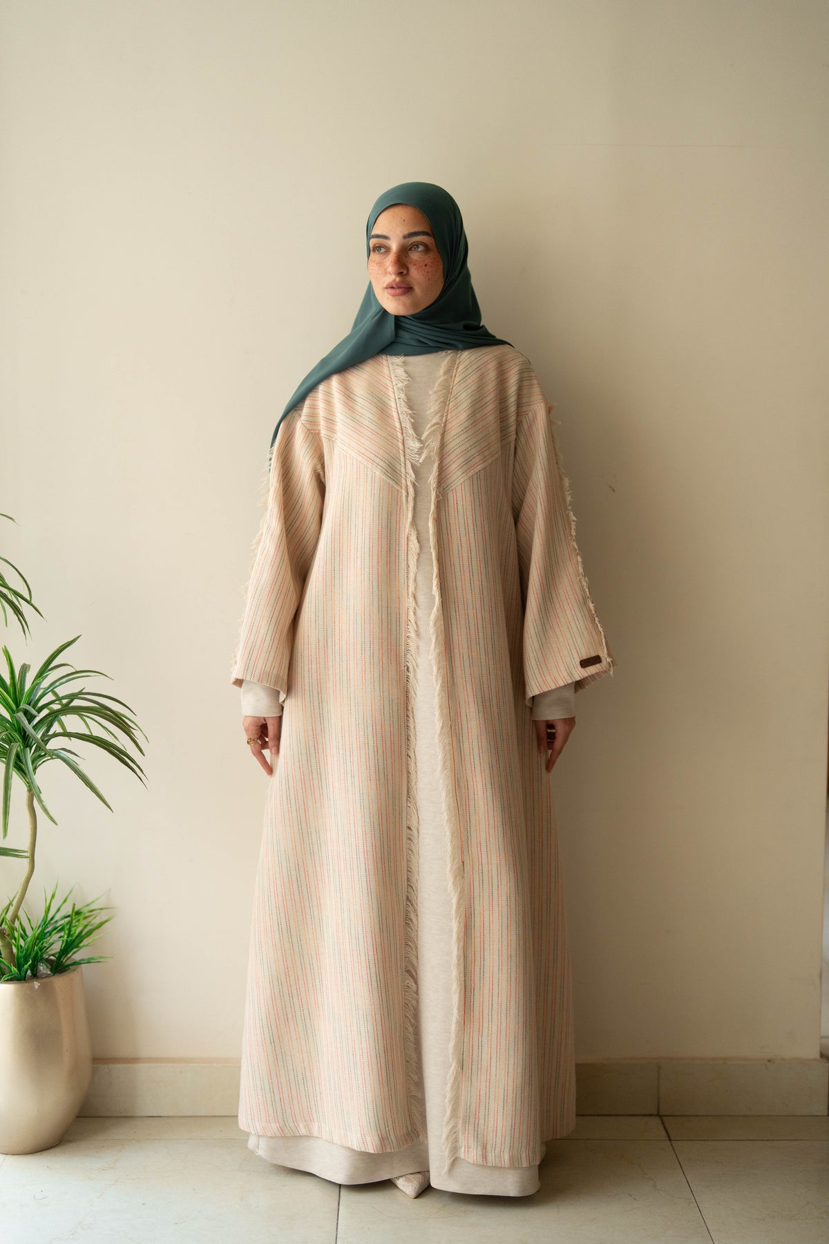 Effortlessly transition from day to evening with our Noor Abaya. Crafted from high-quality linen and adorned with warm color strips, this abaya offers both style and comfort. With its versatile design and luxurious materials, it is the perfect addition to any wardrobe. Elevate your modest fashion game today with the Noor Abaya.
